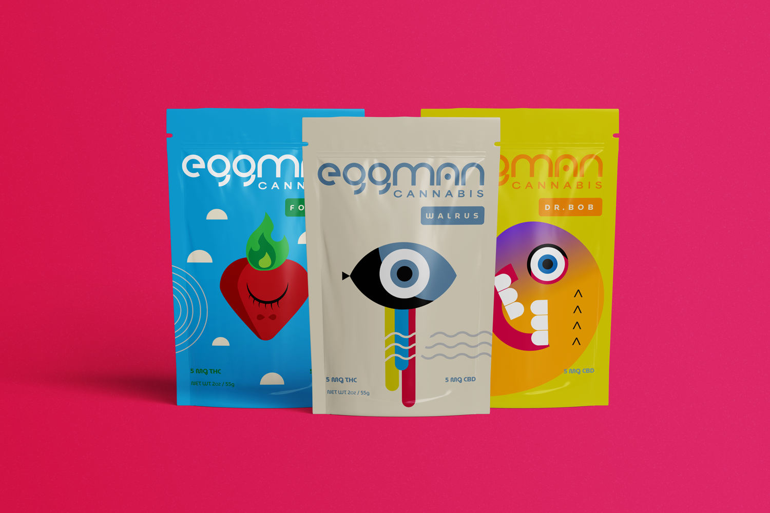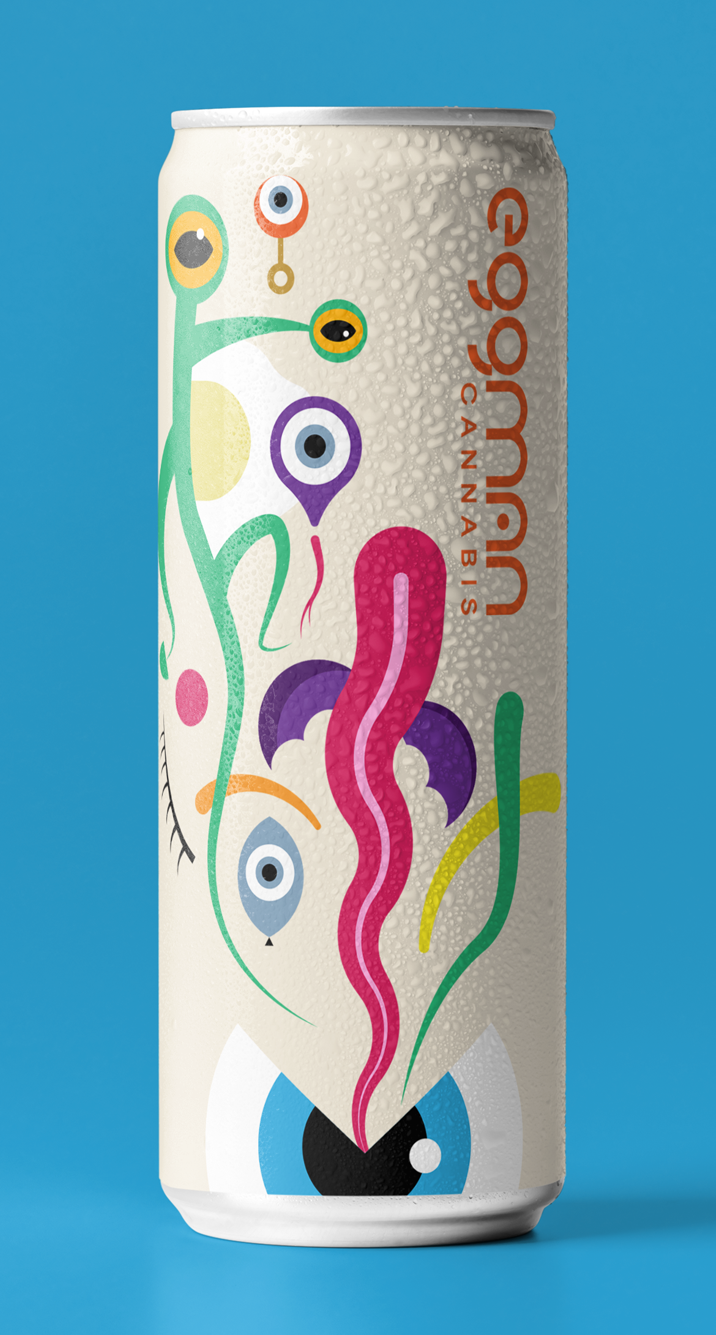 Eggman Cannabis, a high-end dispensary committed to organic practices with premium flower, offers a diverse selection of high quality cannabis products. The brand design conveys a balance of refined minimalism and stylish colorful surrealistic imagery with Bauhaus influences.