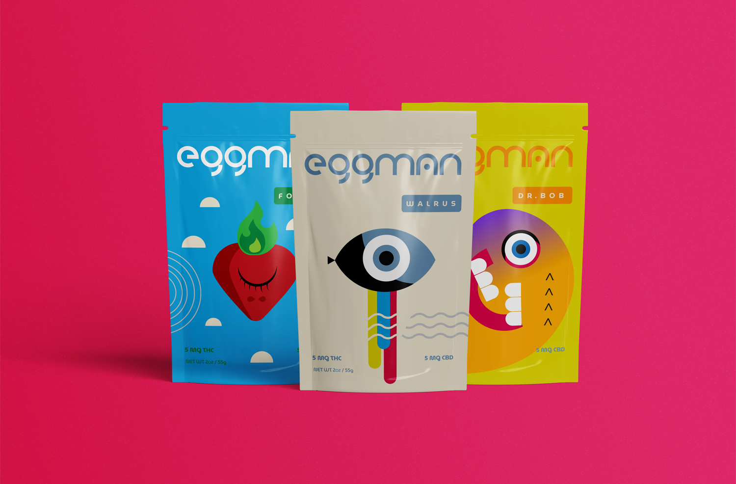 Eggman’s wordmark combines Minimalist and geometric designs, giving it a stylish memorable look. The brand draws inspiration from Bauhaus and psychedelic art from the 1960s. Solid bright colors can be found complementing the minimalist assets of the brand. Eyes are the main design asset in the brand, symbolizing and making reference to the physical effect of THC lowering blood pressure and dilating blood vessels in the eyes.