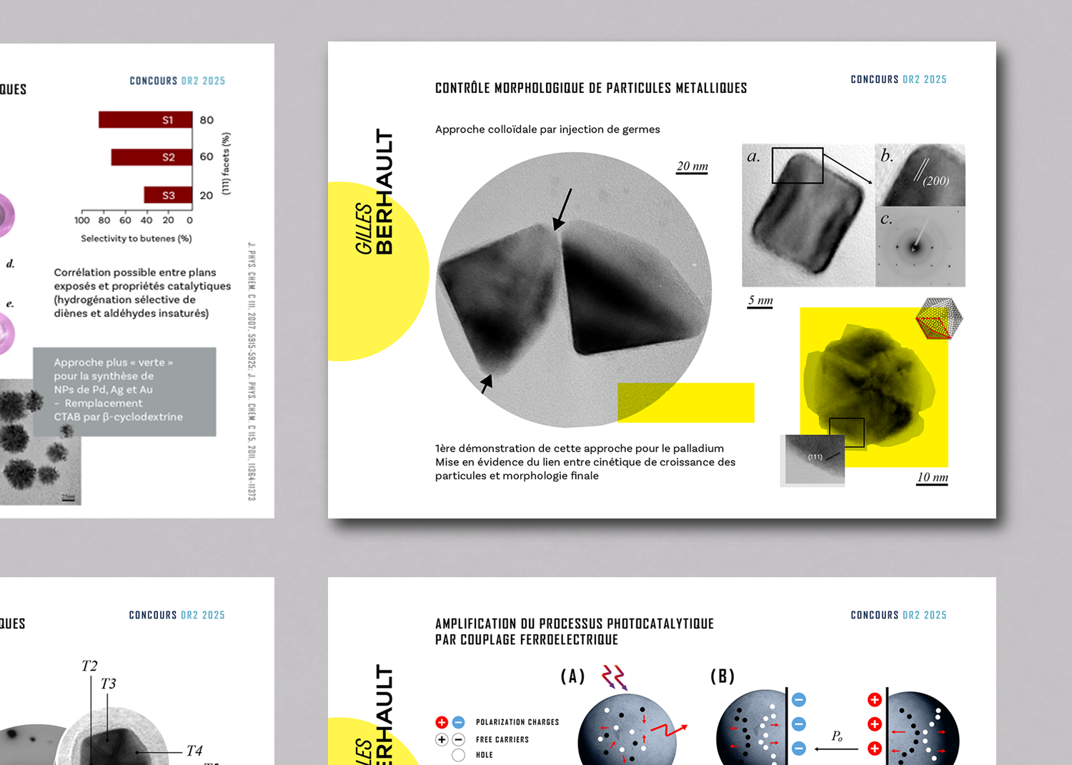 Redesigned visual tools strengthen the way chemical structures, reactions, and properties are communicated, identified, and analyzed, using a distinctly utilitarian design approach. Constructist-style illustrations contrast with low magnification TEM images; creating a striking visual contrast that makes the material more engaging and easier to interpret. Clean sans serif typography supports clarity throughout the slide deck, aligning with the overall aesthetic. Alongside the slide presentation, a complementary booklet version of the design was also produced.