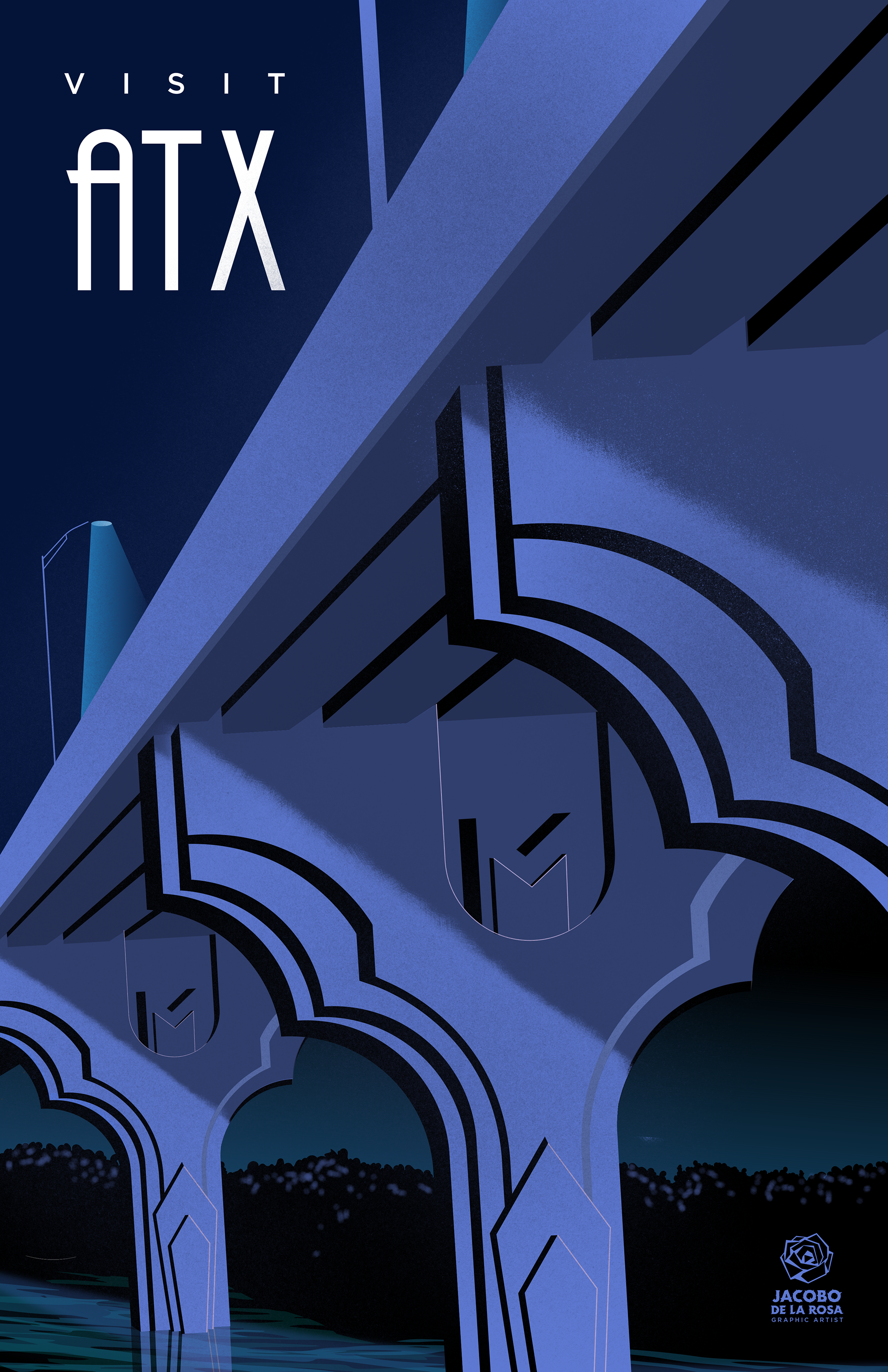 Series of poster designs promoting the cities of Juárez, El Paso and Austin. Each poster conveys its city’s uniqueness in a dark deco style.